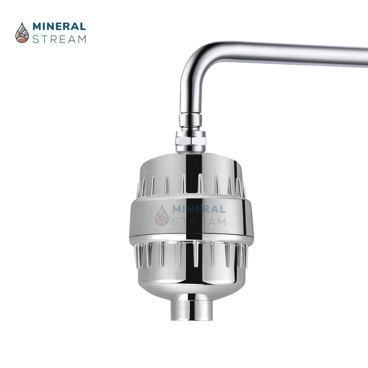 Screw the connector (seen at the top of the filter) onto the shower arm tightly by hand.